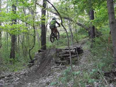 So, last weekend I did some trail building out by my apartment. It wasnt too big a deal, you know I raked all of the leaves from the past fall and winter off of an already established trail and chopped dead fall that was hung up and too tall to hop over with a bike. I saw this cool rock on the side of the trail that was tallish on the up hill side and then just sloped into the hill it was on. You can see in in the picture to the left. Well I decided I needed to make a new trail that could utilize this cool natural feature. I spent all Saturday and most of Sunday building this trail that takes off from the already established trail. I made a jump out of fallen logs in a way that the landing was this cool rock. I dug other rocks out of the ground and made an "artificial" rock garden and then I chopped a large fallen tree into a 30 foot length and flattened the top and made a log ride/jump/drop.